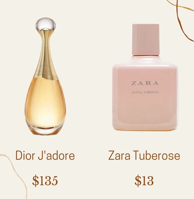 Nếu đã là 1 tín đồ của nước hoa thì bạn không thể nào bỏ qua chai Dior J'adore với hương thơm thanh nhã, sang trọng; thiết kế phần cổ cao kiêu sa. Tuy nhiên nếu vẫn xót ví vì em nước hoa này thì bạn có thể thử dùng Zara Tuberose. Với mức giá rẻ chỉ bằng 1/10, Zara Tuberose được đánh giá có nốt hương khá giống Dior J'adore với hương thơm hòa quyện của cam quýt, vani, hoa nhài… Tuy độ lưu hương của Zara Tuberose không thể sánh bằng Dior J'adore nhưng ở phân khúc giá rẻ thì đây vẫn là chai nước hoa rất đáng thử.